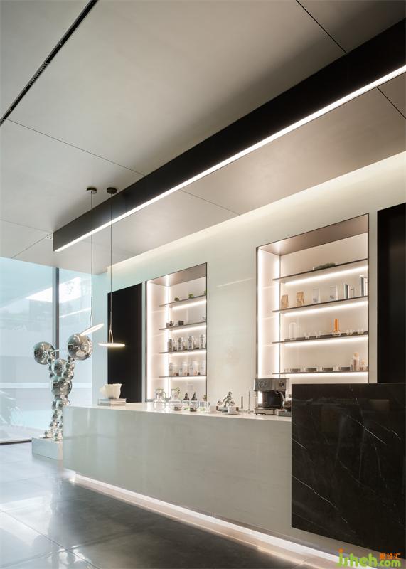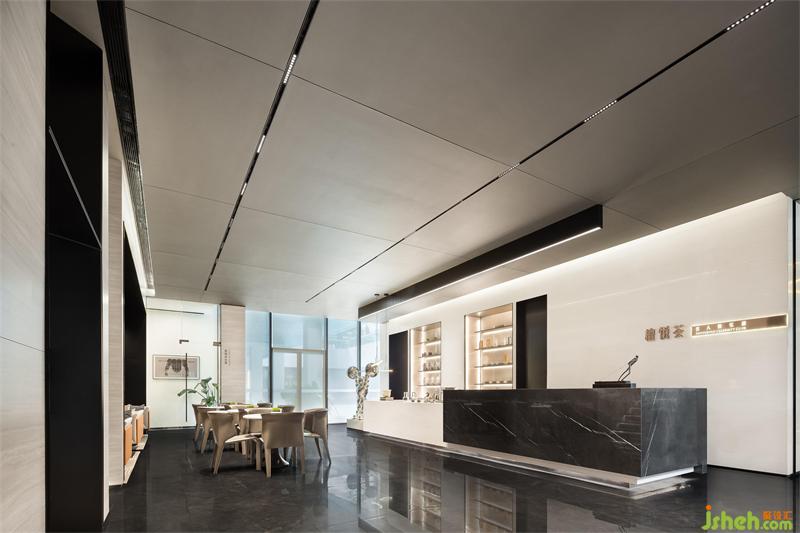從接待區(qū)出發(fā),開啟邕江文化之旅。潑墨大理石瓷磚地面和木紋石墻面從入口處延伸至內(nèi)部,頂面的軌道燈與造型線條燈如同城市軌道與橋梁橫梗其上,在藝術(shù)燈光與自然光影的交相輝映下,以多元視角觀照著來者內(nèi)心的精神共鳴。