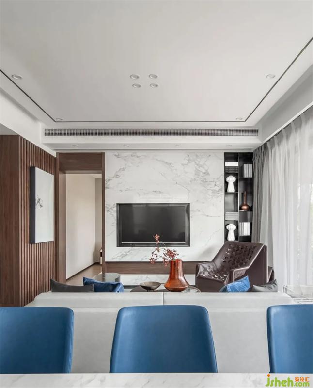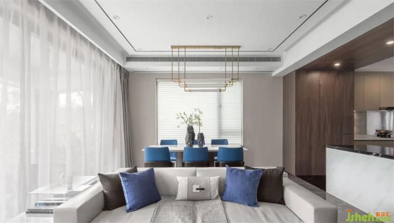 落地窗對(duì)景自然,映出庭院蔥蘢翠綠之意。別墅裝飾于開(kāi)放式空間鋪陳對(duì)藝術(shù)的觀想,引入自然光,輔以不同色度的主調(diào)藍(lán),在一種有層次波瀾的靜謐感里,回應(yīng)居者內(nèi)心的前衛(wèi)藝術(shù)潮流與生活態(tài)度。