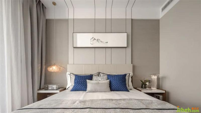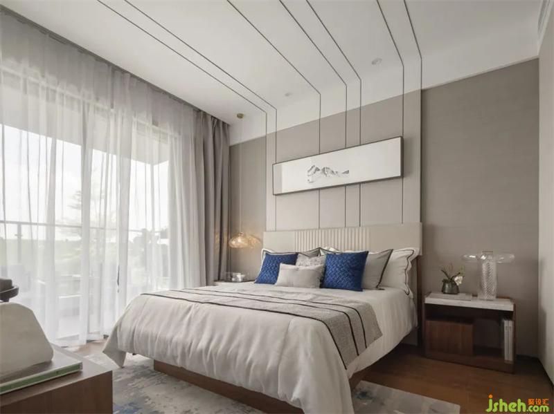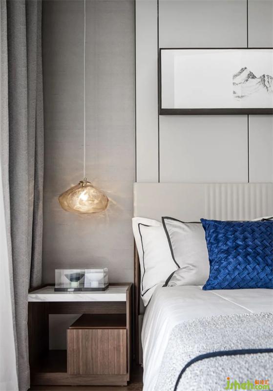 清風(fēng)拂縵,無界自然,臥室色調(diào)相對(duì)平和克制,別墅裝飾以灰色為床頭背景,木質(zhì)與布藝的材質(zhì)交織出平和感官氛圍,主張向外延伸的思想張力。