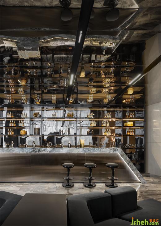 流動(dòng)的是宇宙和時(shí)光,使人在浩渺中漫游未來(lái)。水吧區(qū)將開(kāi)放性與包裹性相結(jié)合,利用空間流線型線條和地面金屬、石材、皮革、透明材質(zhì)相互呼應(yīng)共鳴,360度變幻沉浸式的感官體驗(yàn)。