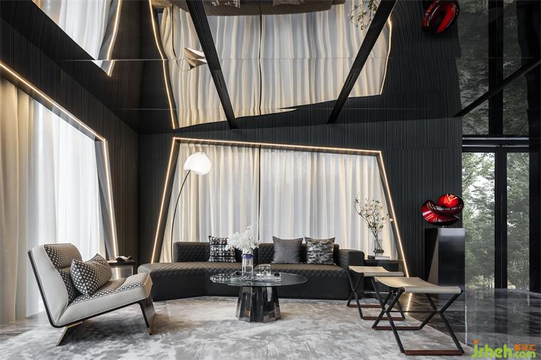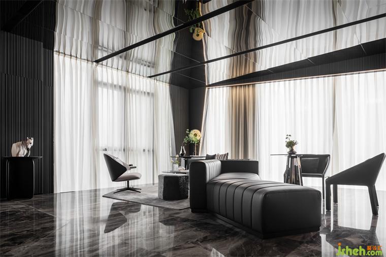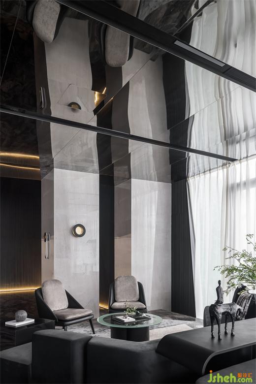 延續(xù)宇宙的神秘,洽談區(qū)空間以大量鏡面材料為背景,頂面采用灰鏡斜面設(shè)計(jì),實(shí)現(xiàn)縱深感。不規(guī)則異形窗框的使用,渲染出充滿生機(jī)的空間力量。在精準(zhǔn)的比例中,用嚴(yán)謹(jǐn)?shù)膸缀沃刃騺?lái)構(gòu)建感性的場(chǎng)域,生活的姿態(tài)與宇宙的無(wú)盡在這一刻得以共鳴。