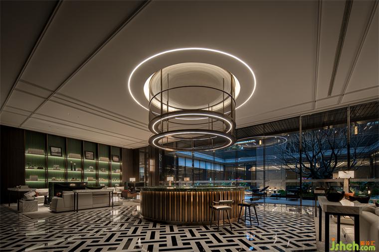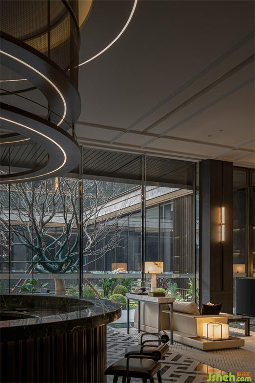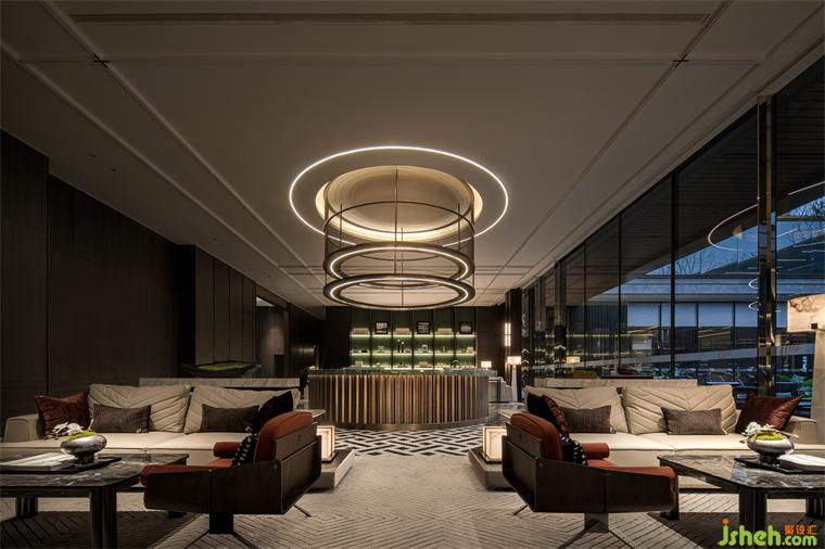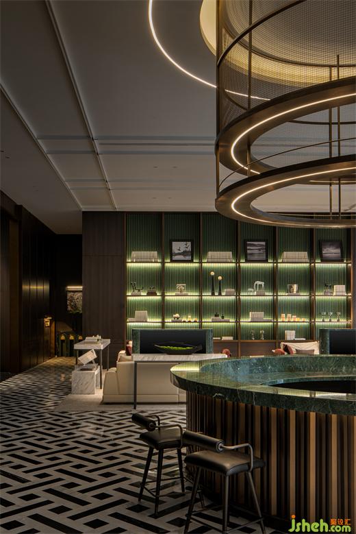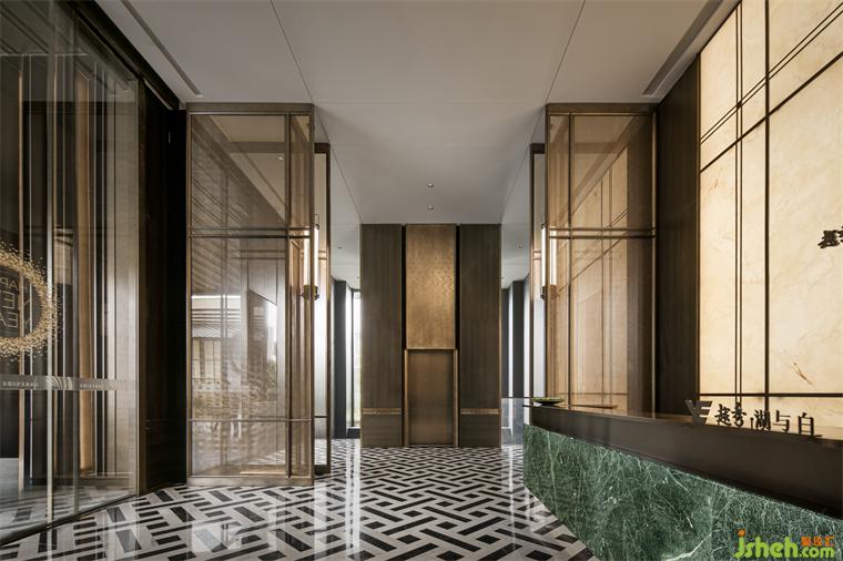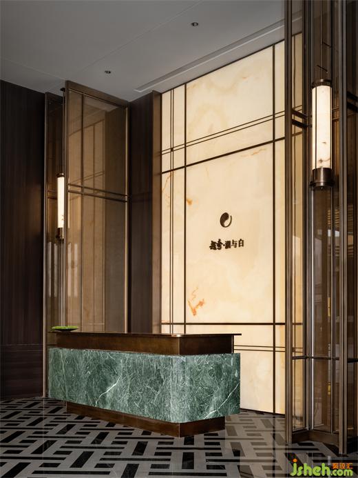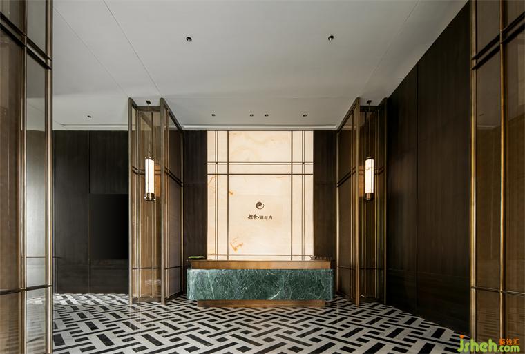 接待廳設計著力于傳統(tǒng)對稱美學的追求與沿襲,通過通高藝術(shù)屏風、云石壁燈與超大尺度天然玉石造景,取意現(xiàn)代美學的形態(tài)氣韻,構(gòu)設微縮的湖岸意境。墻面以深色木飾面為底色,配以藝術(shù)玻璃、少量金屬及玉石打破沉悶,加以普拉達綠奢石作為跳色點綴,于賞心悅目間,勾勒出清麗古樸的畫卷,以美好姿態(tài)迎接遠方貴客。