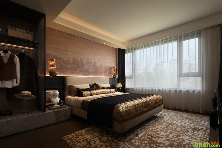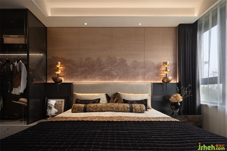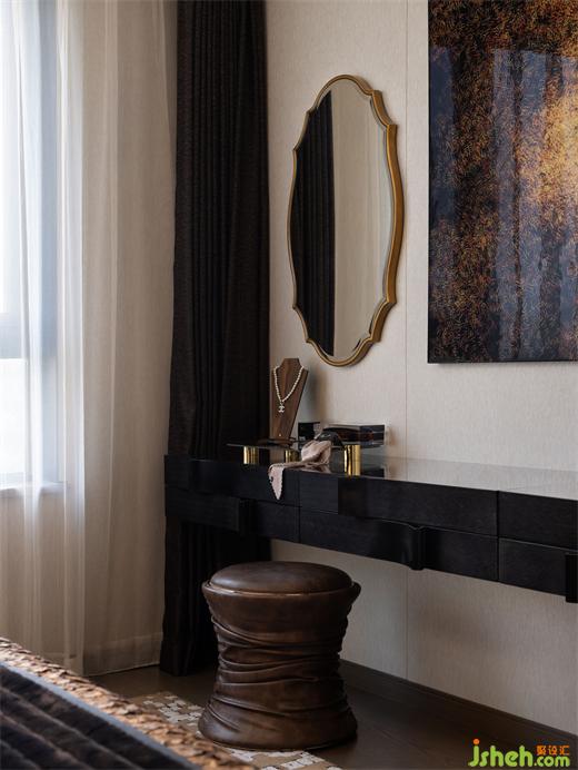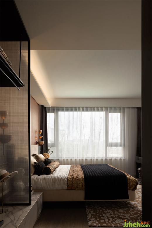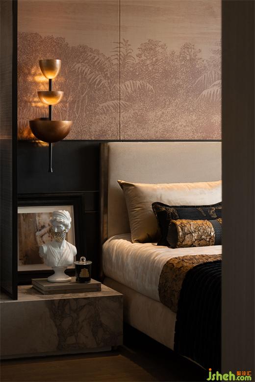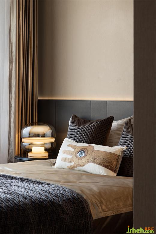 次臥整體色調(diào)以淺色為主,輔以深色腰線軟包與藝術(shù)擺件、燈具,若隱若現(xiàn)間幻化為一段不同情緒的悠揚旋律。