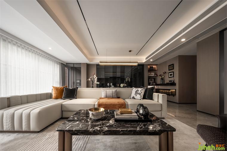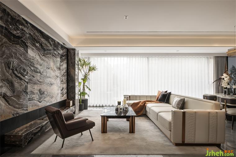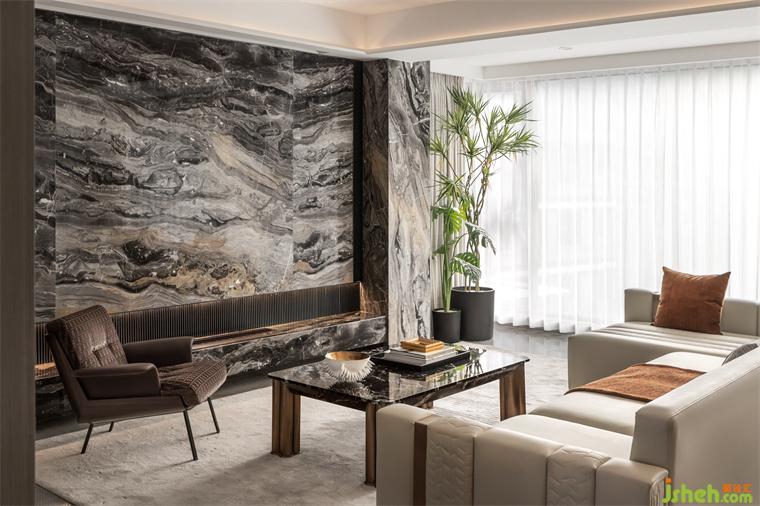 半環(huán)繞式的沙發(fā)隔絕了室外喧鬧,為空間帶來了更多的沉浸之感??蛷d的大理石墻面線條豐富但不繁瑣。四時的光影在石體上流轉(zhuǎn),金屬的堅硬不羈、皮質(zhì)的原生觸感、玻璃的質(zhì)感光澤,各自保有個性又相得益彰,讓原本單一的空間被解構(gòu)為豐富變化的生活情境。