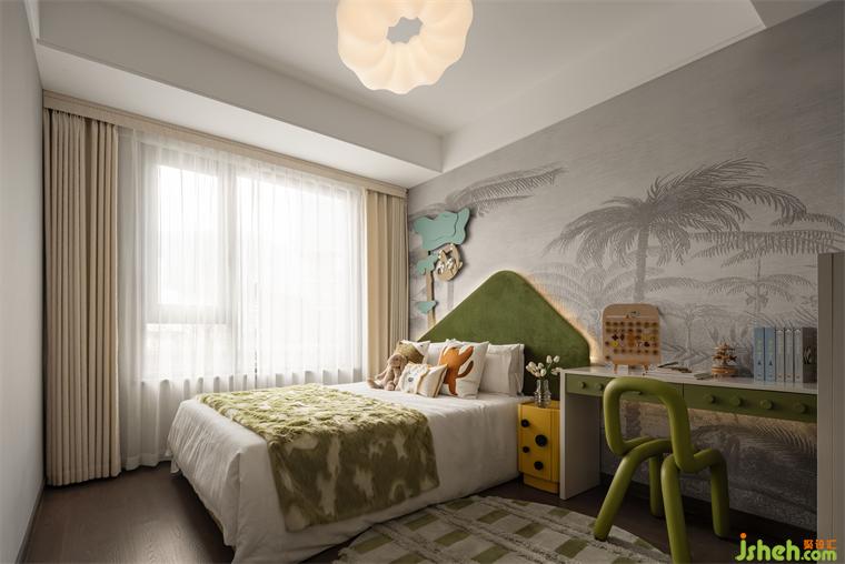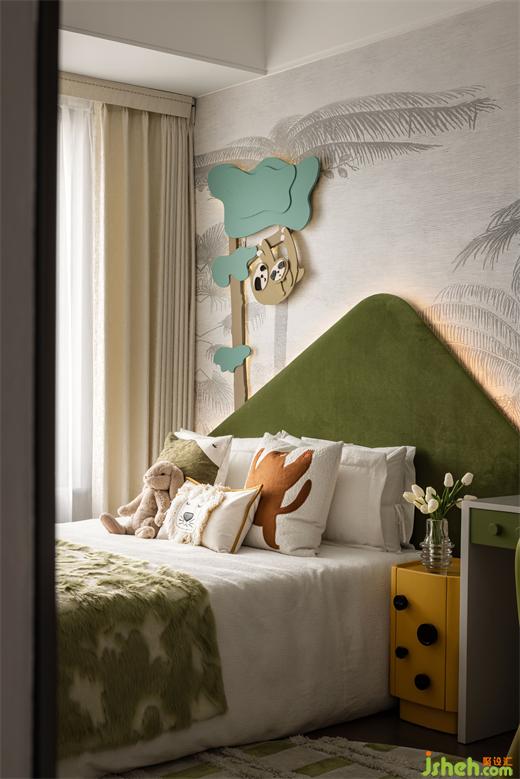 兒童房呼應(yīng)整體色調(diào),簡雅色彩中跳躍綠色的靈動(dòng),在棕櫚樹大幅藝術(shù)墻紙下,一只可愛的猴子爬于樹尖,充滿了童真的意趣與幻想,渲染出與夢(mèng)想有關(guān)的故事。