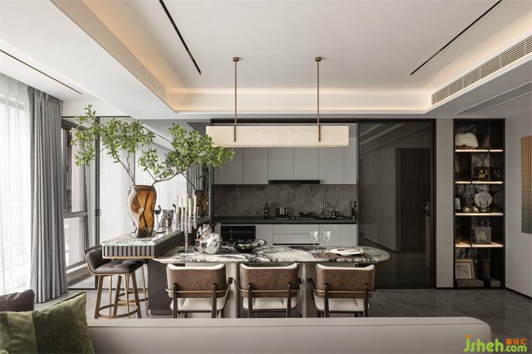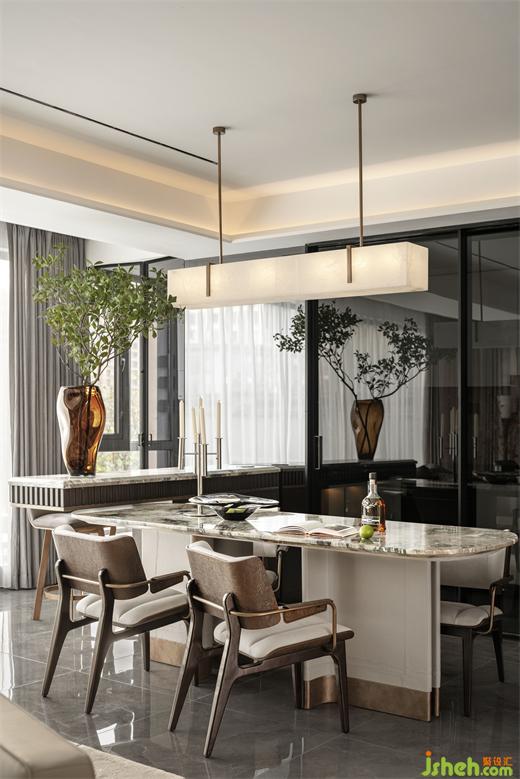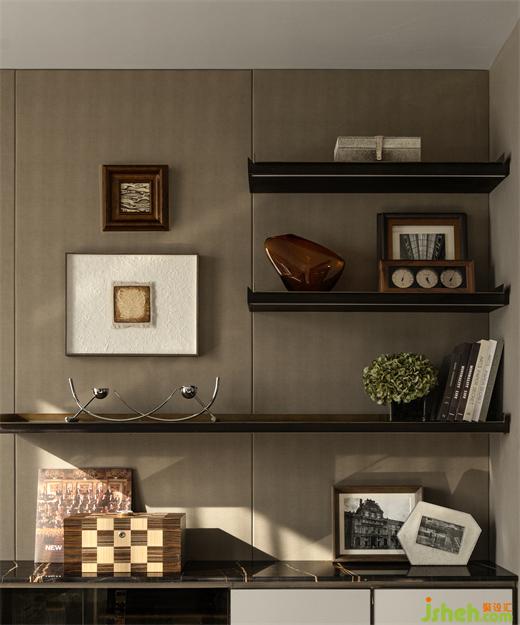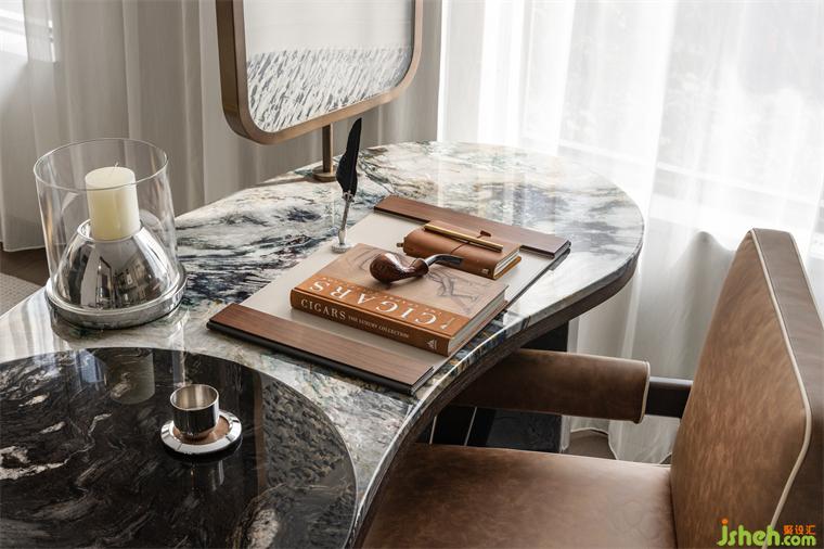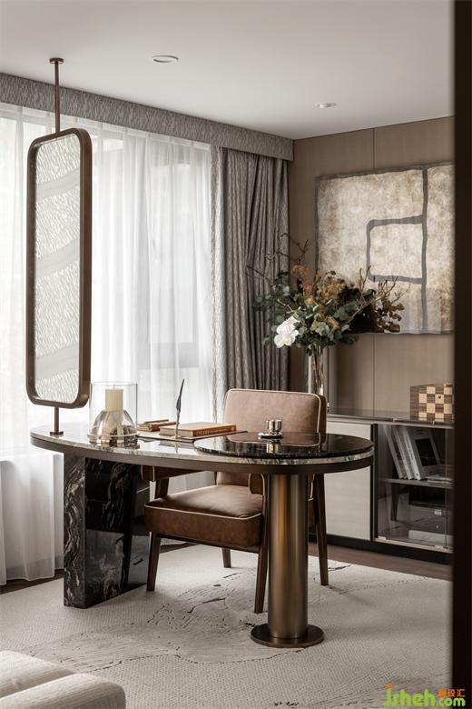 主臥一隅設(shè)置為書房,樣板間設(shè)計既能與主臥相互連通,又作為各自獨立的功能空間,是生活的意趣之地。徜徉于此,感受時光的詩意與饋贈,城市的喧囂被隔絕,只剩下書頁翻動的聲音和心靈的對話。