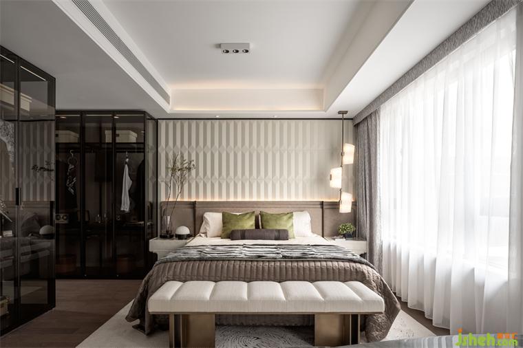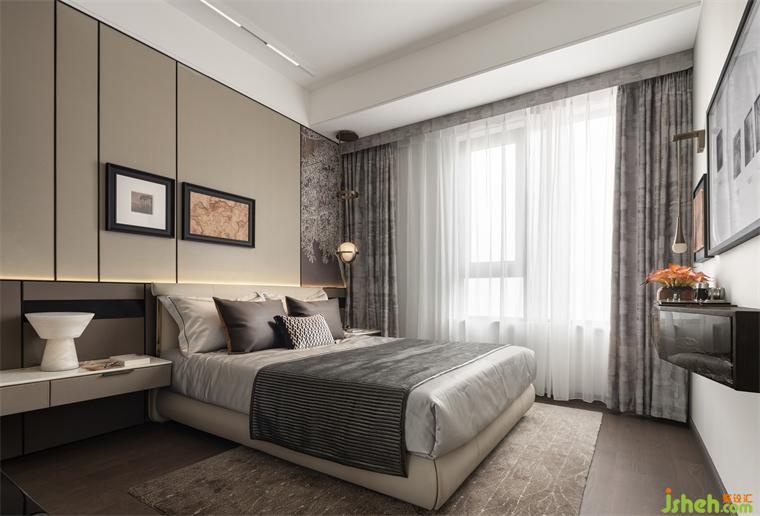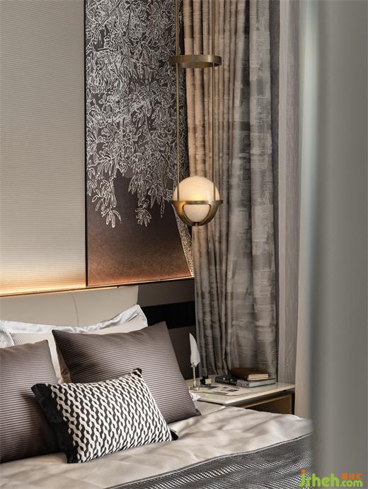 主臥在柔和的色調(diào)和光影中,樣板間設(shè)計以簡雅的細節(jié)表達傳遞出現(xiàn)代生活的低調(diào)精奢與舒適導(dǎo)向。床背板采用幾何軟包鋪貼,木質(zhì)、棉麻材質(zhì)包裹身心,不著痕跡的給予居所主人放松療愈之感。