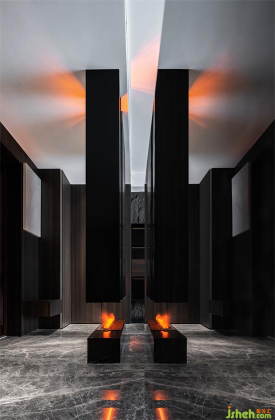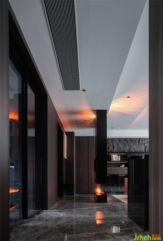 離,便是將空間結(jié)構(gòu)重新劃分,我們在門廳處設(shè)置了一個(gè)懸浮的鏤空玄關(guān),這樣既有效地保證了入戶的儲物需求,也能更好的兼具沙發(fā)區(qū)域的隱私。家裝設(shè)計(jì)儀式感便由此而來
