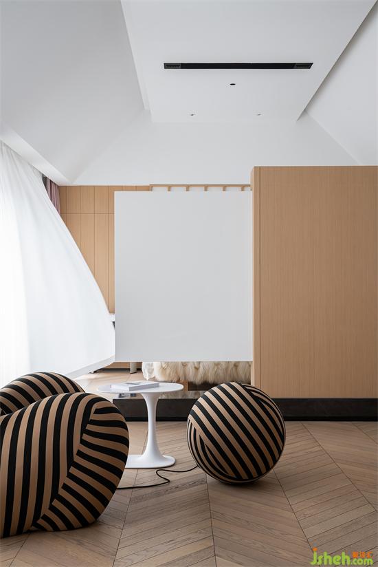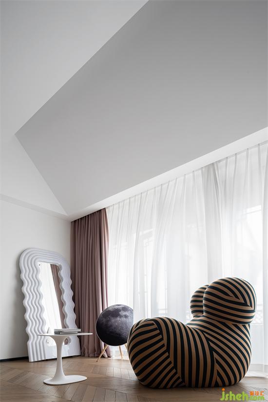 書房與床之間做了低矮的隔斷,別墅設(shè)計(jì)功能上略做區(qū)分,視覺上也保障了睡眠的隱私感。