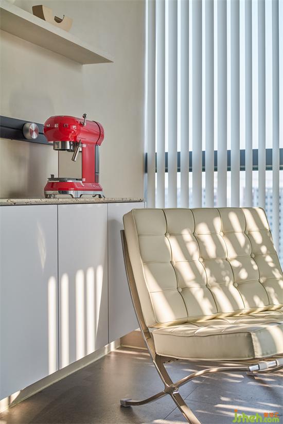 Sunshine, coffee and green plants, visual far and near can feel the vitality and vitality. The grid light and shadow transformation of vertical curtain and the sequence of space can also present different interests at different times. The array of curved top surface also breaks the stiff sense of flat space, and the tension of the structure is revealed.