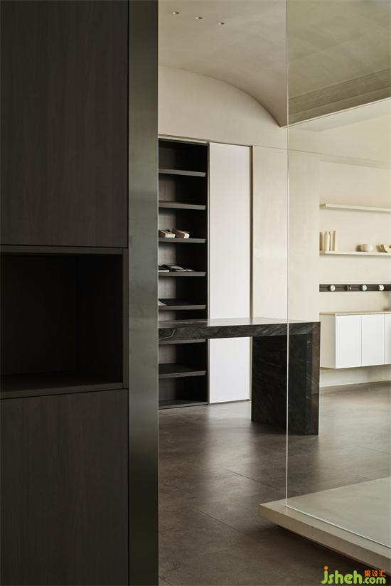 原始建筑有較寬大的立柱與橫梁,因此由門廳過渡到休息區(qū)的空間流暢度便尤為重要,我們把橫梁的兩側(cè)分別作為兩個圓弧的起點與終點,自然優(yōu)雅的在窗簾盡頭完成排布,而通體的微水泥包裹則把空間的一致性與流暢性完美結(jié)合。