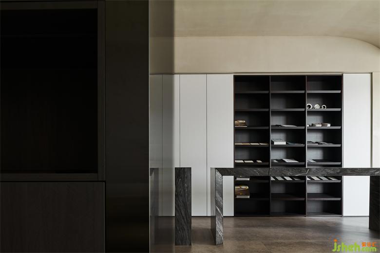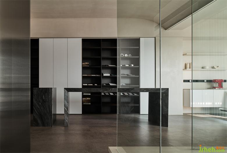 The open moving line ensures the penetration of the space. Different forms of display shelves are set up in the material selection area. The combination of open and closed can meet the storage of different materials, and different colors are quite visual tension. Ecru stainless steel links the two Spaces with facades.