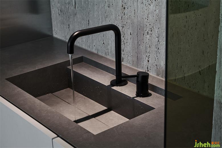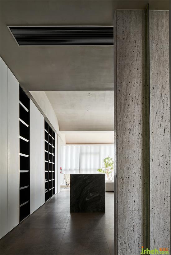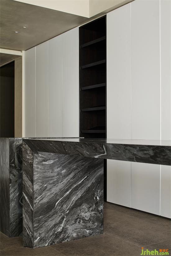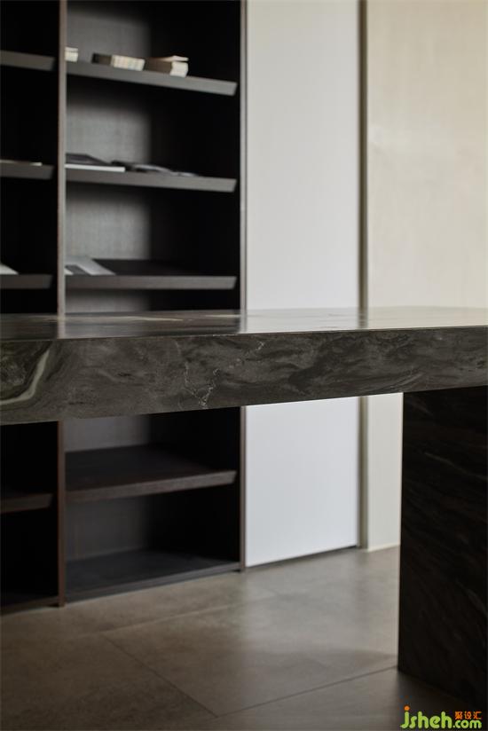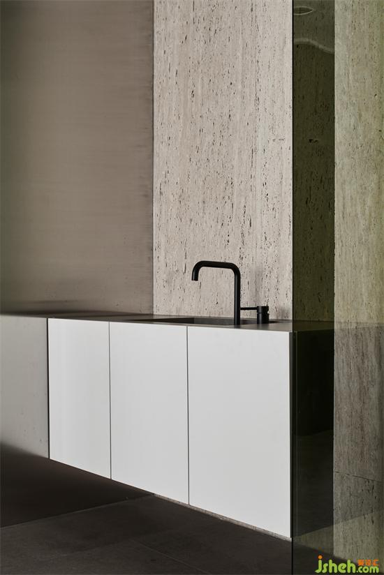 茶水臺材質(zhì)由一體化巖板水槽構(gòu)成,完整感更強(qiáng),而粗獷的洞石與精密的不銹鋼形成強(qiáng)烈視覺沖擊,毫厘之間見細(xì)節(jié),側(cè)面是一塊鍍膜玻璃,活躍了一些氣氛。