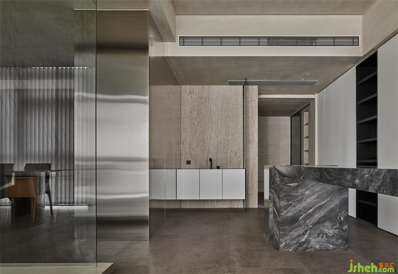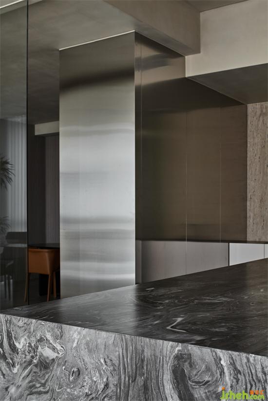 多樣化的材質(zhì)串聯(lián)豐富了空間的層次關(guān)系,不銹鋼、洞石與巖板的對話讓空間多了幾分冷靜。