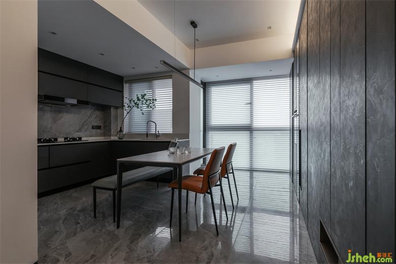 Calmness is the design fundamental key of the space, from the dark of kitchen area to the wood color of corridor to the coffee color of the living room, just have soft, texture is full.