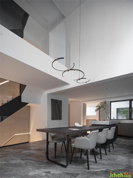 餐廚區(qū)域做了開放式一體化的布局,沒有了墻體的束縛,空間的通透感便更加明顯,島臺與餐桌呈一字型穿插鏈接,餐廳上空做了挑空的處理,在空間的高度上也有了上佳的體現(xiàn),大氣與舒適度一直貫穿設計的始終。