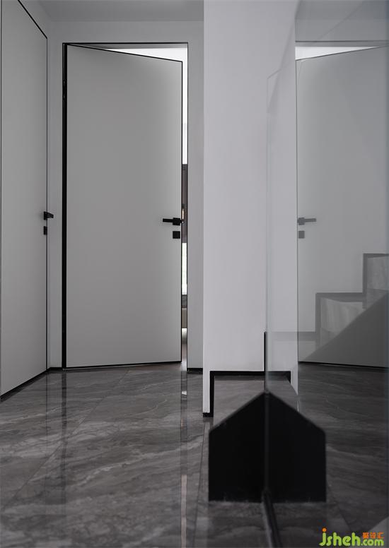 The depth scale of the space is simplified. The wall of the staircase is flattened in the form of wrapping pillars to make the shape of embedded handrails. Under the guidance of light and shadow, it guides the moving lines up and down. Step and ground integrated material, extremely narrow embedded step light belt, frameless and wall of the same color door all emphasize that this is a minimalist space.