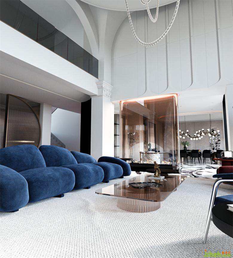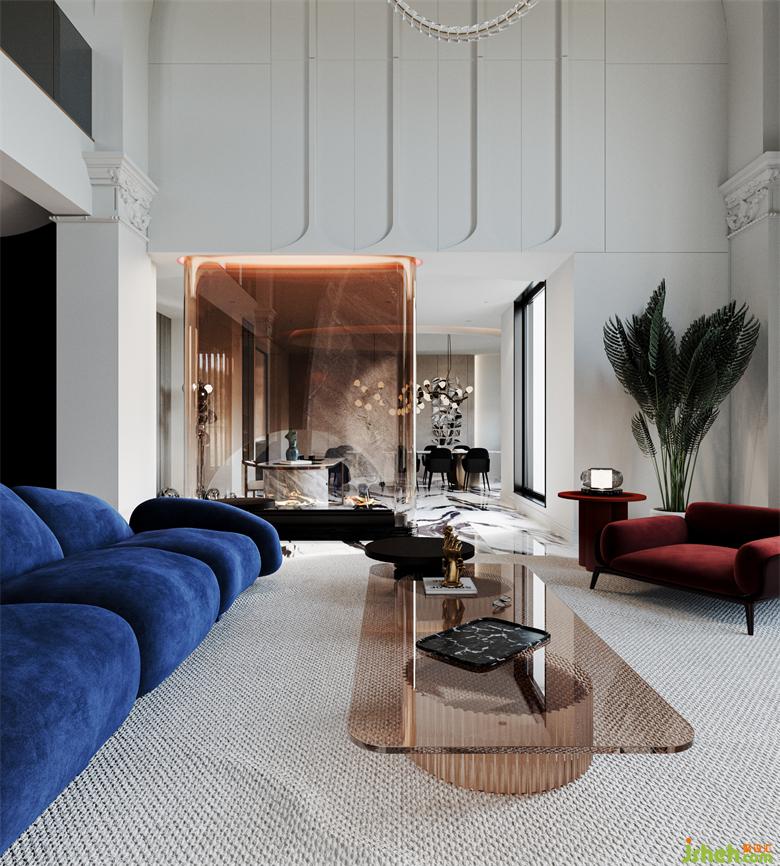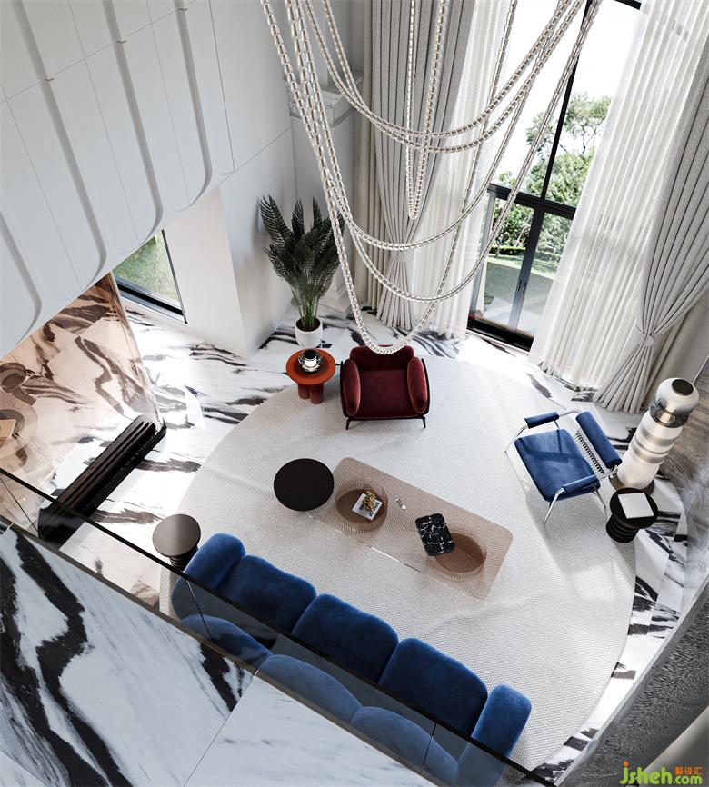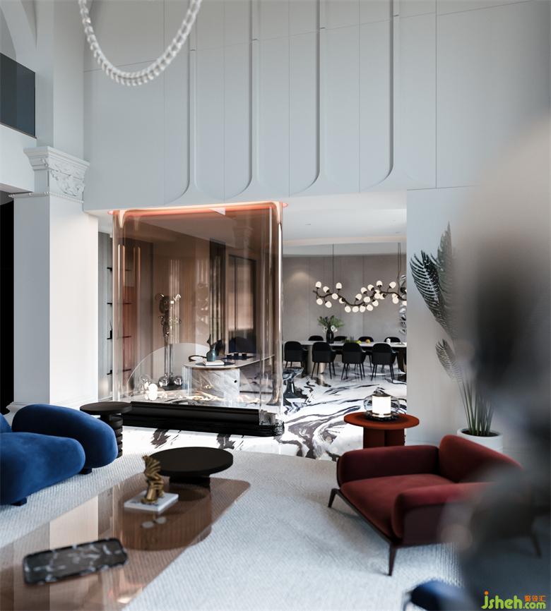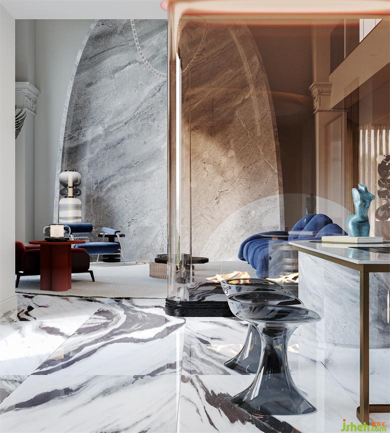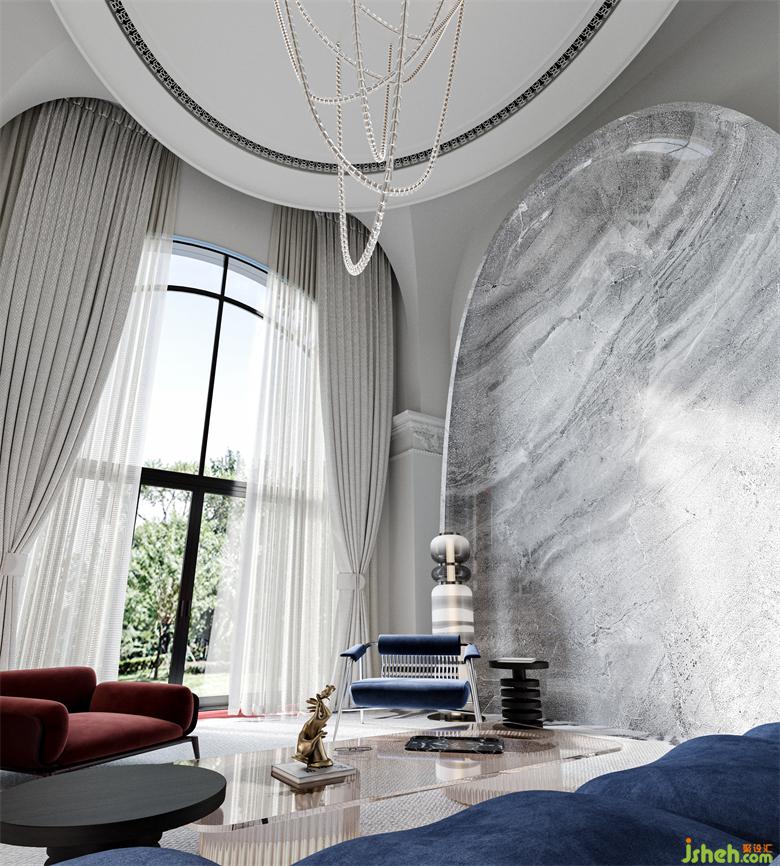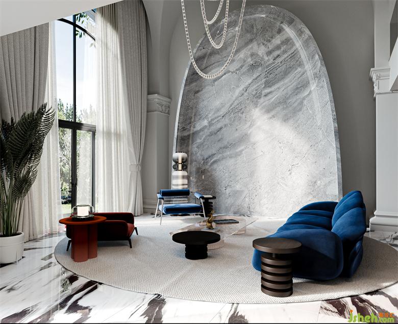 穹頂式的客廳設(shè)計(jì)將房屋的優(yōu)雅氛圍拉到極致,石材與窗戶的優(yōu)美線條在四周羅馬柱的加持下愈發(fā)營造出古典浪漫的氣息,別墅設(shè)計(jì)憨態(tài)可掬的Mavimatt-Lithos沙發(fā)則為空間增添了些許趣味,紅藍(lán)雙色的搭配上下和諧呼應(yīng)。