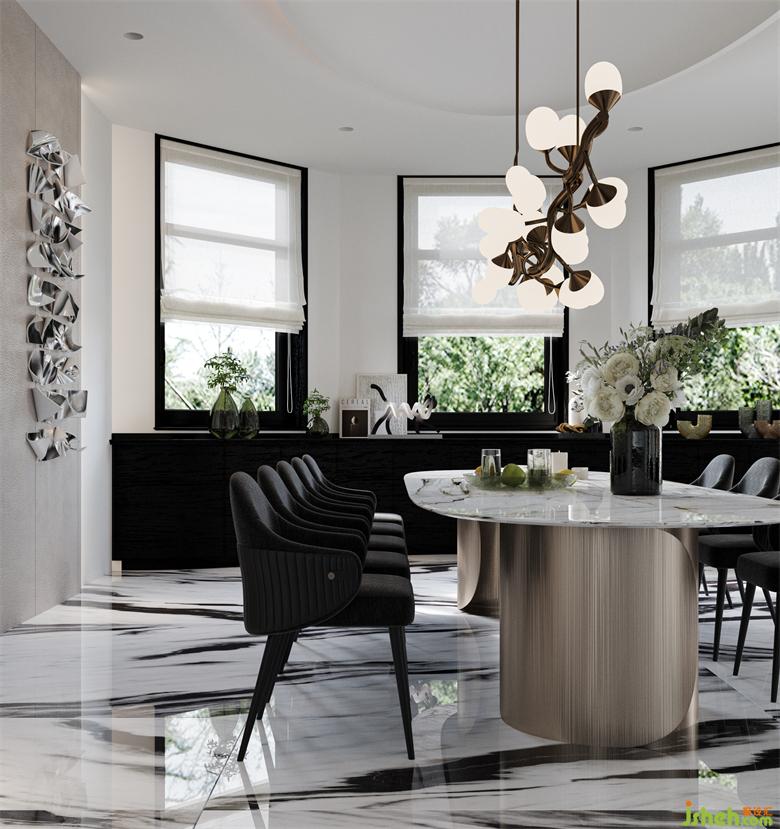 有機(jī)玻璃作為軟隔斷把客廳與餐廚區(qū)域做了分離,餐廳做了更為現(xiàn)代的處理,別墅設(shè)計(jì)大色塊的黑色與金屬不銹鋼為空間賦予了更為摩登的質(zhì)感。