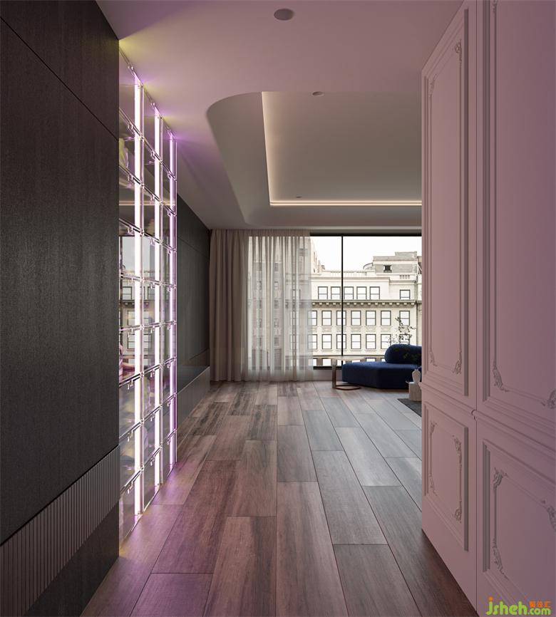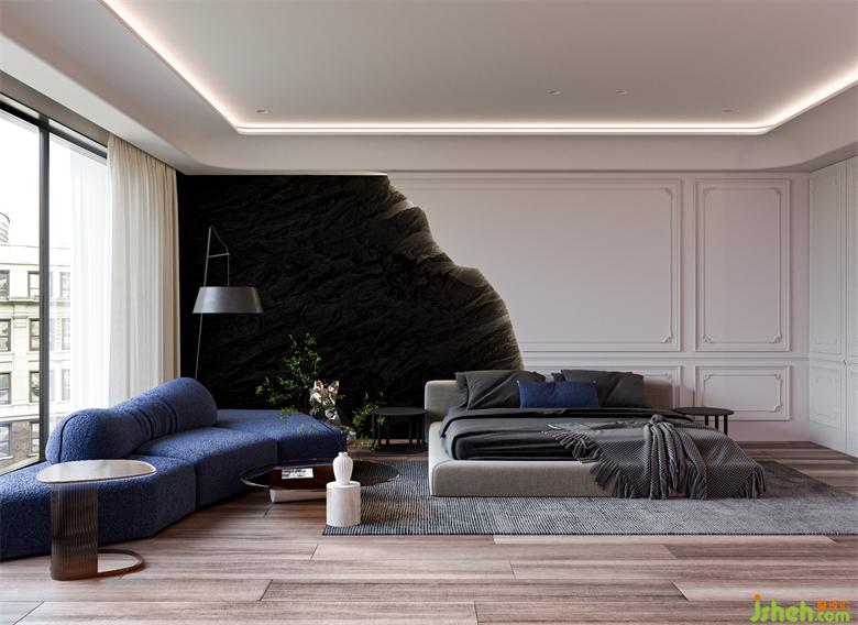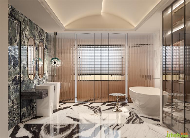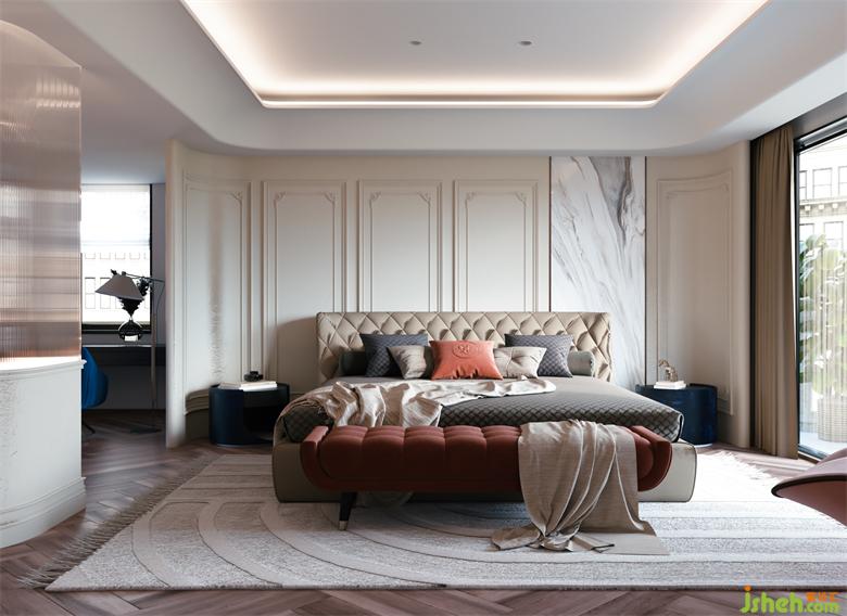 臥室的處理則更加充滿法式的優(yōu)雅,異形混油的護(hù)墻板與紋理強(qiáng)烈的石材,別墅設(shè)計(jì)將休息區(qū)與衛(wèi)生間都做了更加藝術(shù)化的設(shè)計(jì)。