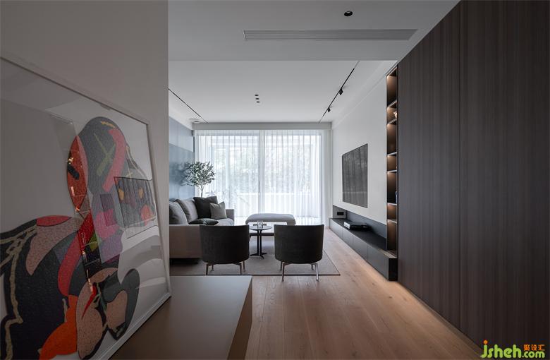 On integral space tonal quiet harmony, gray black attune penetrates from beginning to end, the kitchen chooses the log that occupies the home more and white collocation, more set off cook relaxed mood. The dining room is partially separated from the outdoor landscape by a vertical curtain.