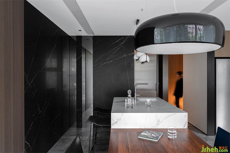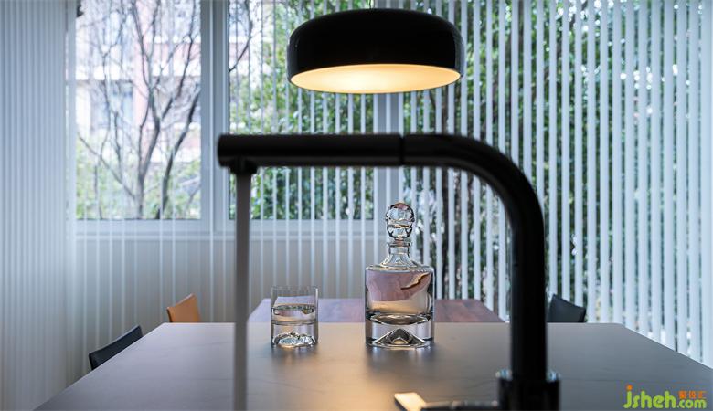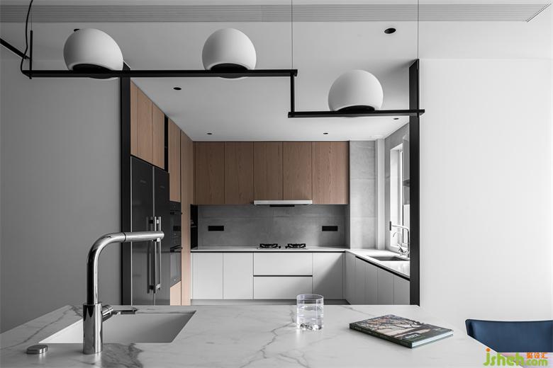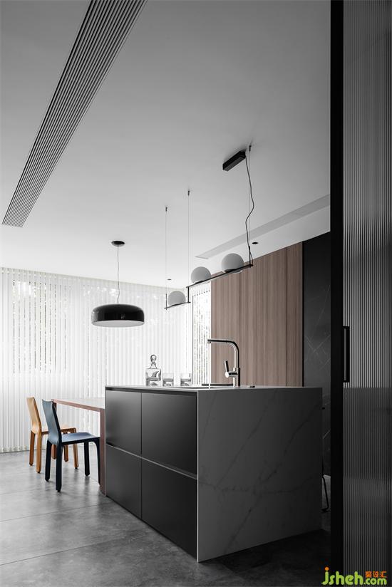 整體空間色調(diào)上靜謐和諧,灰黑色調(diào)貫穿始終,廚房選擇更加居家的原木與白色的搭配,更加映襯烹飪者放松的心情。家裝設(shè)計(jì)餐廳與室外景觀被垂直簾若隱若現(xiàn)地隔開。