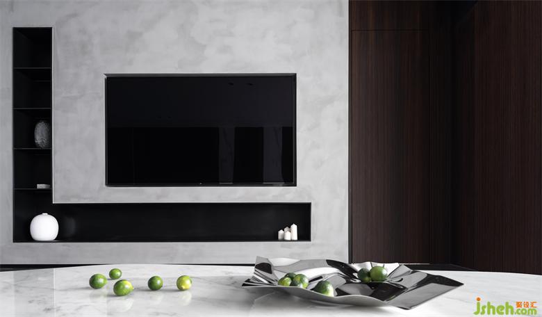 清水混凝土質(zhì)感的藝術(shù)漆勾勒出電視墻的大致線(xiàn)條,完全內(nèi)嵌的電視機(jī)與不銹鋼超薄開(kāi)放層板營(yíng)造出簡(jiǎn)約的處理手法。