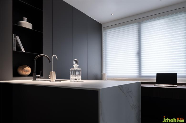 另一個較大的結(jié)構(gòu)改動在于廚房功能的調(diào)整,原有位置空間狹小,很難安置較為龐雜的廚房設(shè)備,山水樾瀾庭家裝設(shè)計上將廚房改到北面?zhèn)溆门P室的位置,較為方正的布局可以容納廚房的收納需求,家裝設(shè)計原有廚房變成開放式的水吧區(qū)及書房功能,空間使用更加合理且空間的通透性和功能的豐富性都得到滿足。