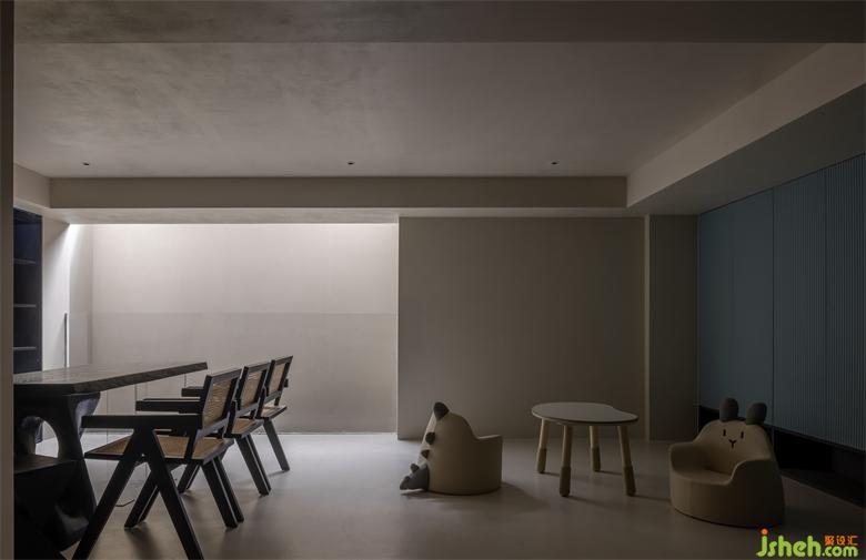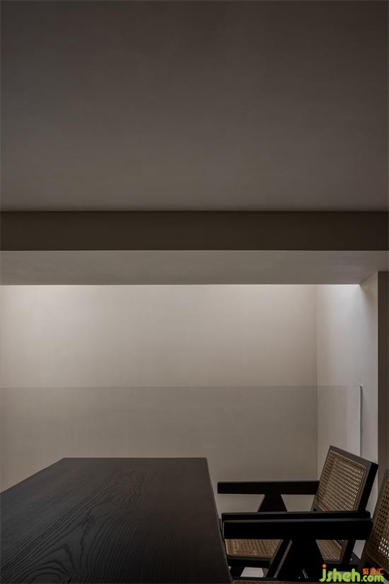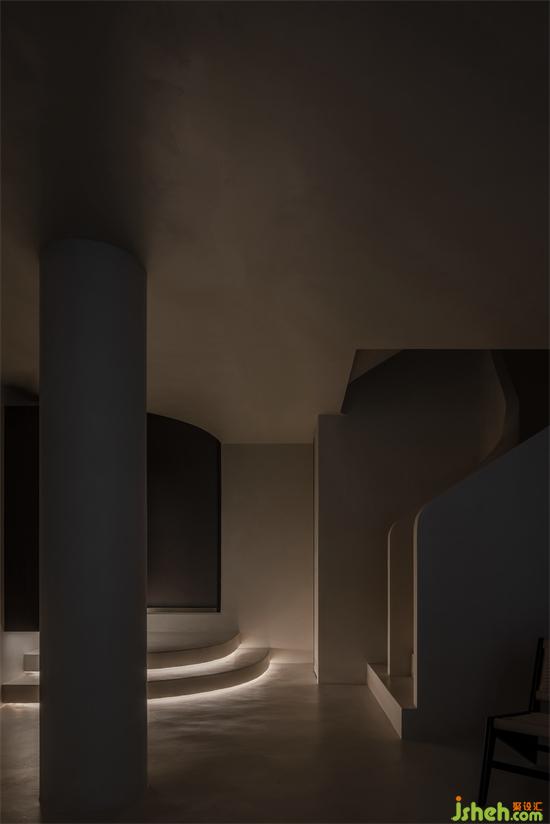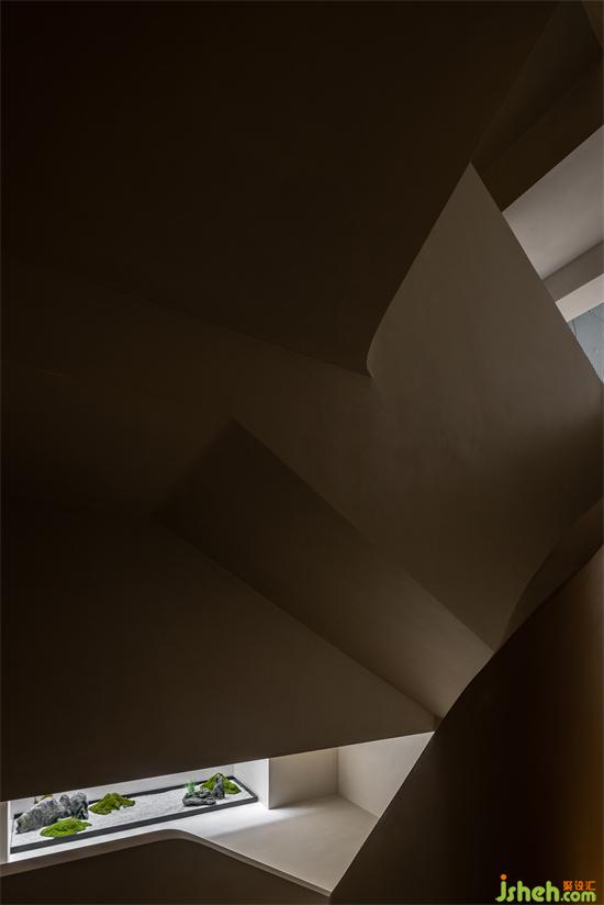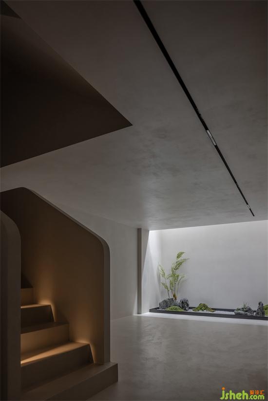 樓梯貫穿至地下空間,則再無多余材質(zhì),微水泥溫潤的包裹著相對(duì)幽暗的空間。純粹的設(shè)計(jì)也彰顯了無即萬象的禪宗思想。