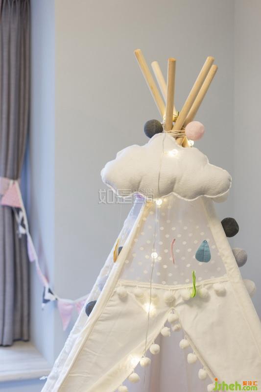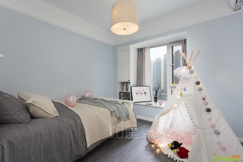 兒童房設(shè)計(jì)公司以淺藍(lán)色為主色,加入可愛粉色軟裝進(jìn)行點(diǎn)綴,充分利用較長(zhǎng)的飄窗增加小朋友讀書區(qū)。