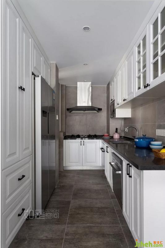 廚房色調(diào)設(shè)計(jì)公司采用灰色、白、黑的搭配,構(gòu)成整潔與酷爽感。