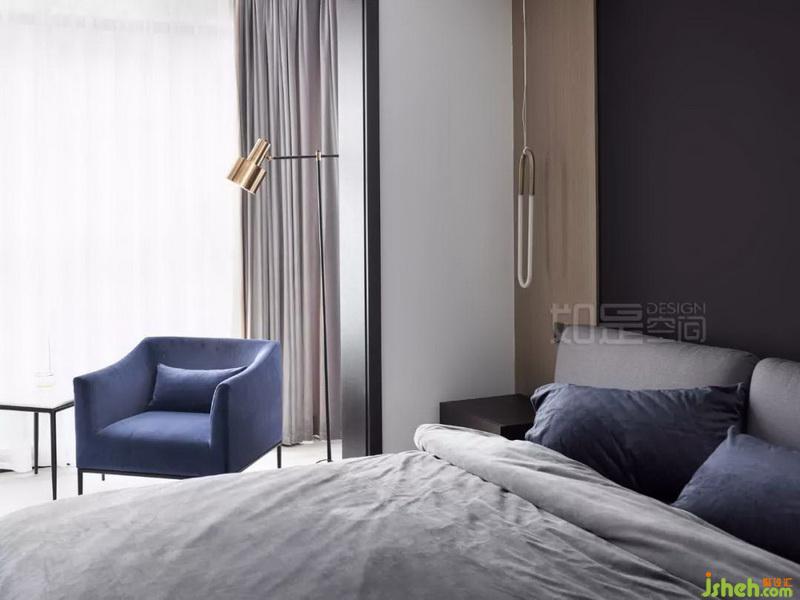主臥的墻面背景室內(nèi)設(shè)計(jì)師選用了暗色系,床體的灰色靠背則在背景的黑色和木色之間起了很好的調(diào)和。