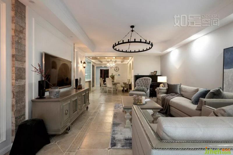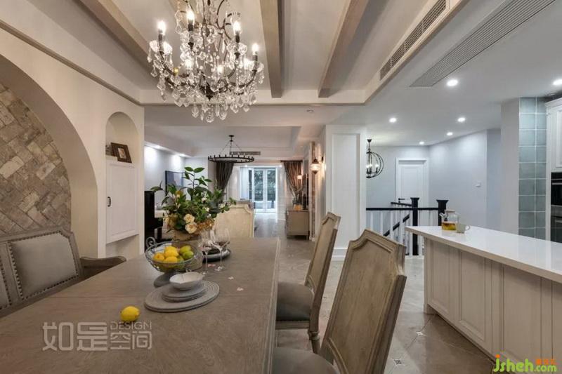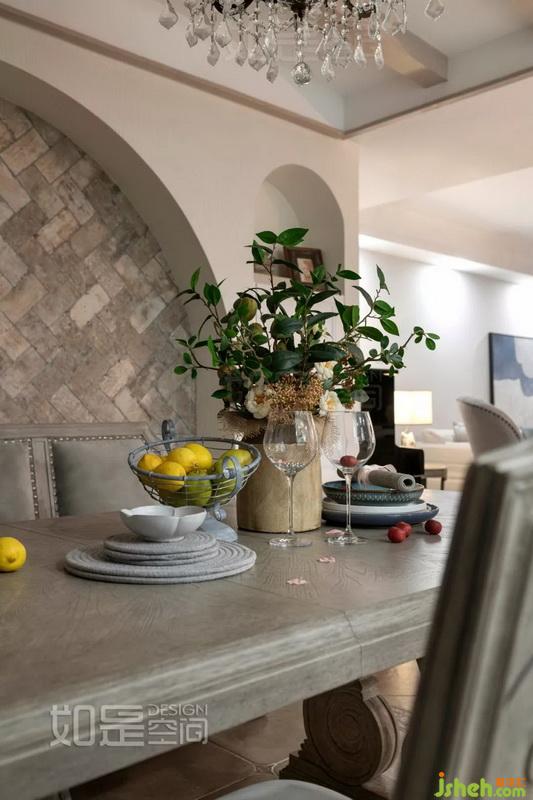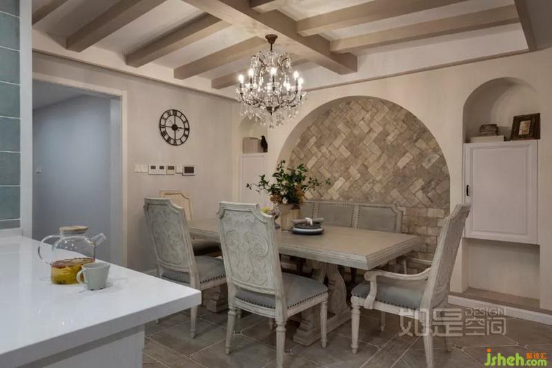 餐廳背景墻采用了對稱的設(shè)計(jì),左右的柜子有一定的收納功能。中間精致的人字形文化石鋪貼出優(yōu)雅大氣且?guī)?fù)古氣息的空間氛圍,吊頂則采用復(fù)古做舊的KD板飾面