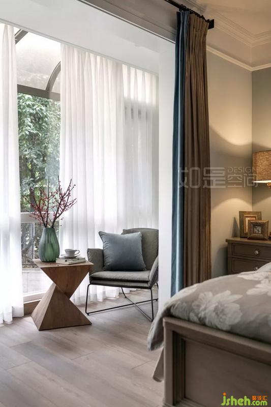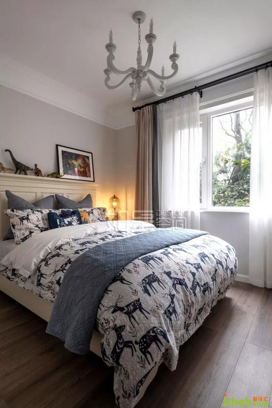 主臥色調(diào)為清新灰綠色,背景色略深一號,層次分明。家具采用和客廳同色系的煙灰色木系。吊燈讓人感受到濃濃的復(fù)古情懷,彰顯屋主優(yōu)雅氣質(zhì)。