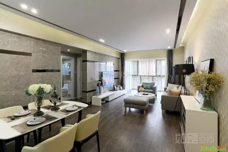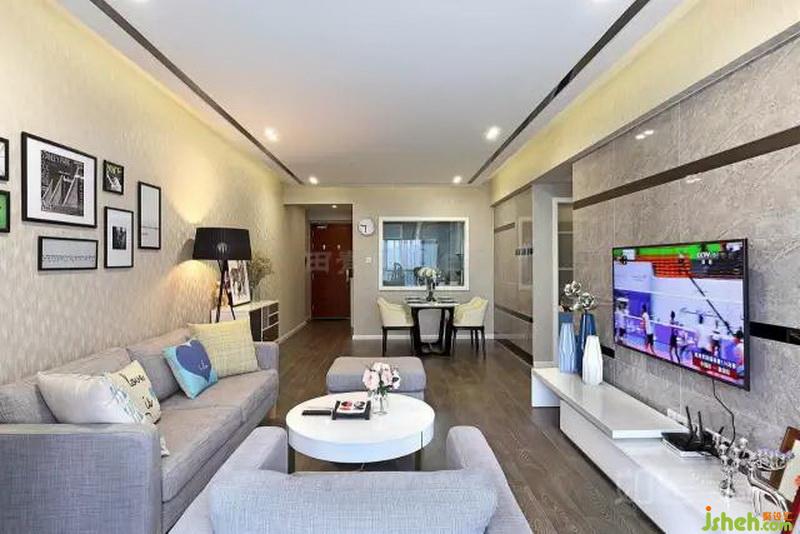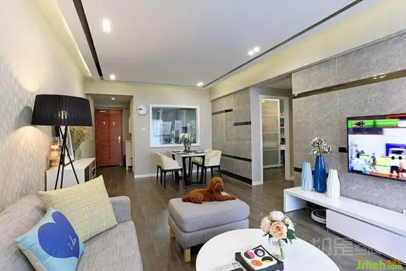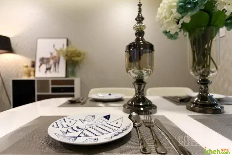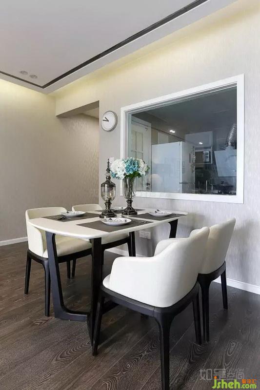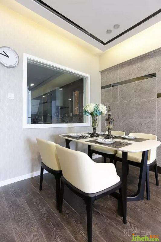 鑒于本案戶型面積偏小,餐廳墻面太小。所以,電視墻和餐廳墻采用一致的材質(zhì),讓人感覺餐廳墻是電視墻的延伸,無形中放大了空間感,彌補(bǔ)小戶局促。