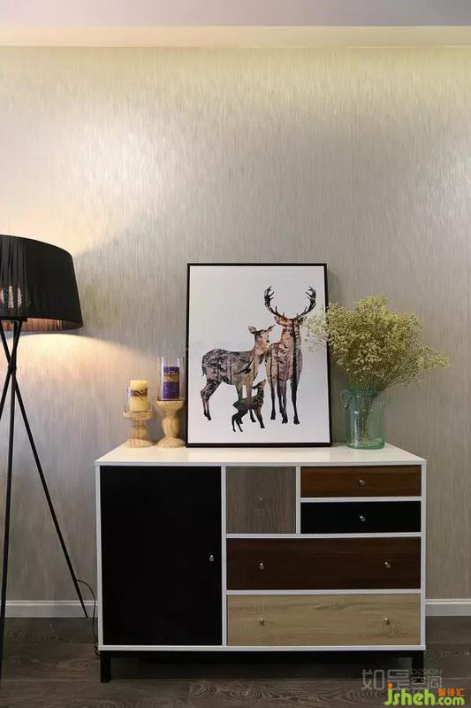 斗柜和落地燈的放置,可以讓入戶到沙發(fā)的距離感縮短,避免了通道顯得過長的缺陷。且斗柜和落地燈形成了高矮錯落的不對稱美。