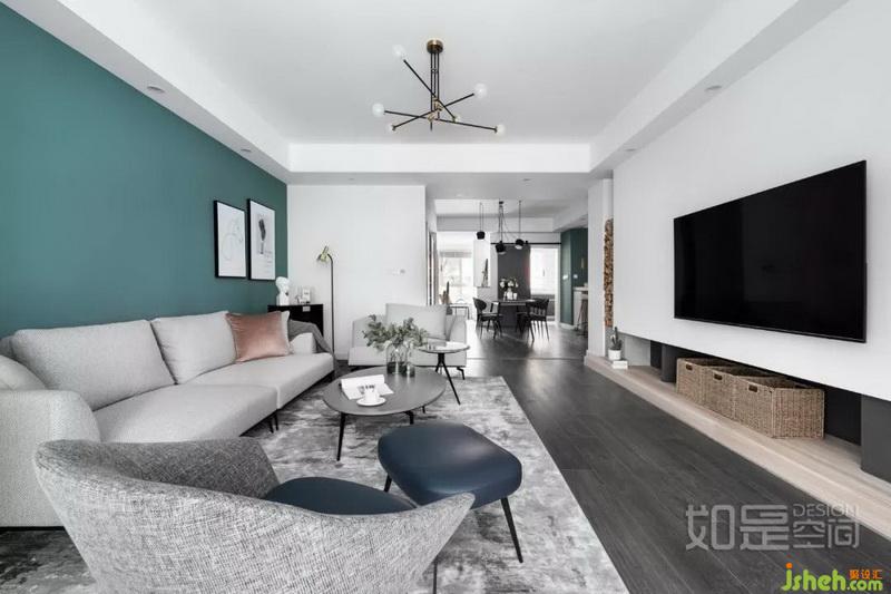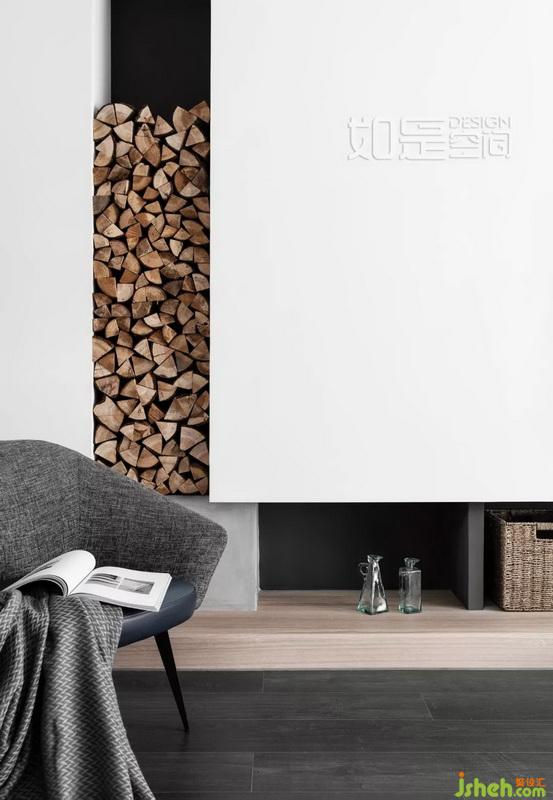 室內(nèi)設(shè)計師在局部采用深綠、淡藍、淺灰色的同時,依然保留了大面積空間的純白,以塑造基本的純凈感。電視墻左側(cè)木柴的堆砌則體現(xiàn)出獨特別致的北歐元素。