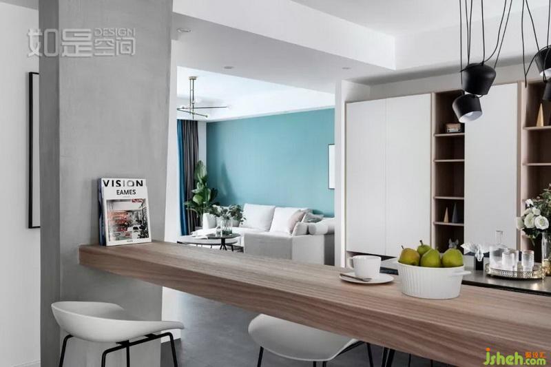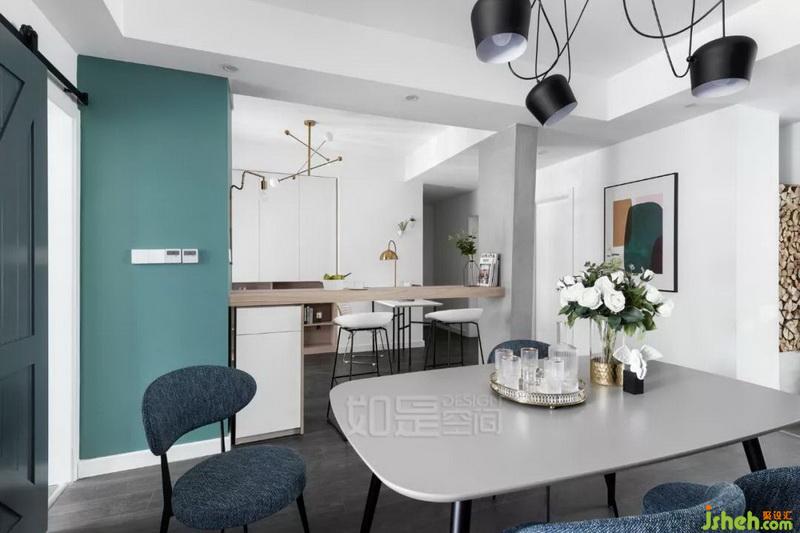 餐桌桌面室內(nèi)設(shè)計(jì)師選用與餐廳茶幾同色同紋理的臺面,餐椅則選用了與休閑椅同色的深藍(lán)色,形成呼應(yīng)