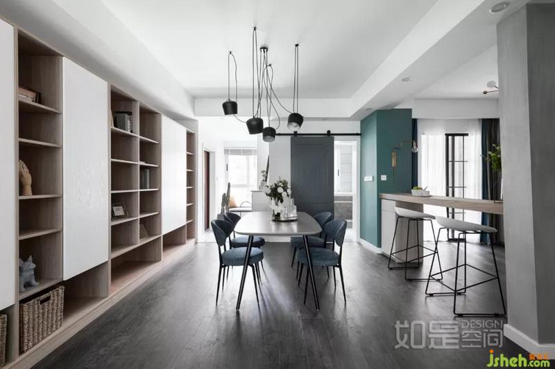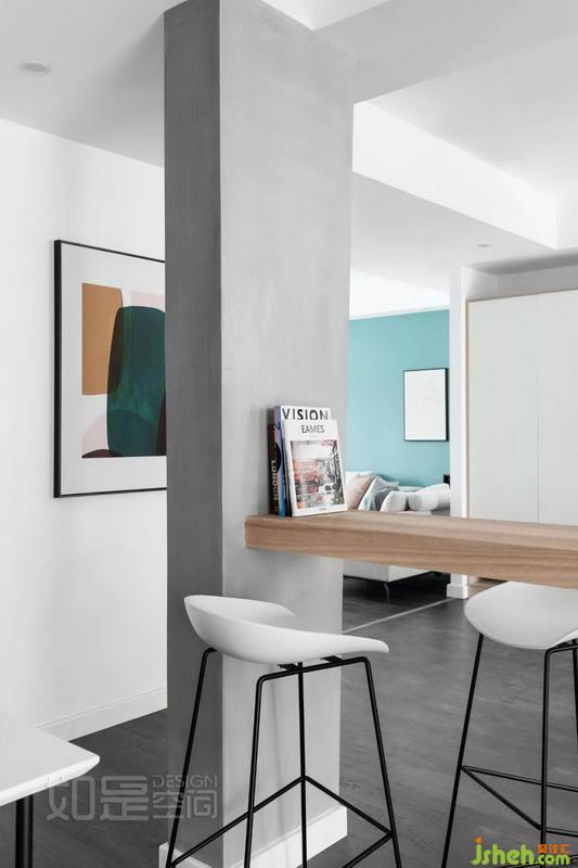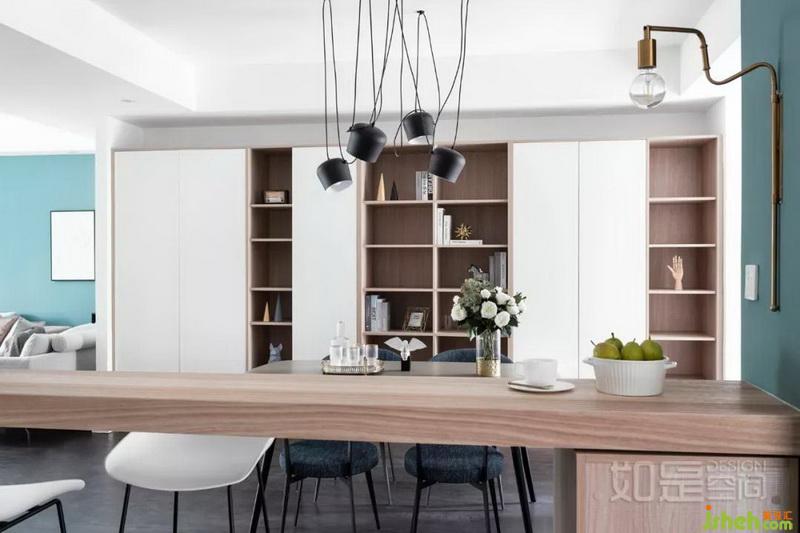 餐廳旁的過道很長,設(shè)計(jì)師在這里打造了一面局部開放的的儲物柜,解決了長期居住后的巨量收納需求,同時(shí)又顯得生動活潑。兼顧了美觀及實(shí)用性。