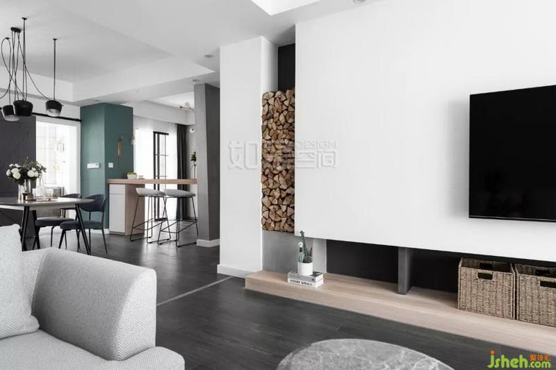 客廳沙發(fā)位置看餐廳、吧臺、電視墻