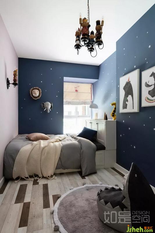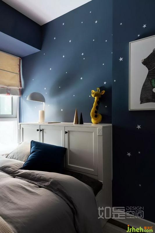 這是為未來二寶打造的房間。深藍色的色調(diào),五角星墻貼,打造出這個夢幻般的星空房。