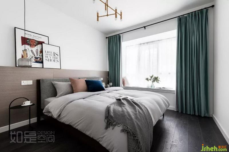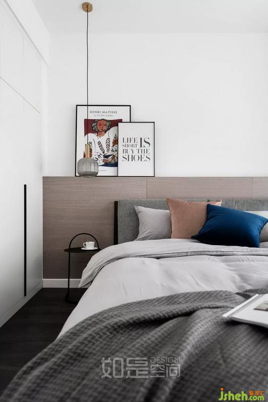 主臥室內(nèi)設(shè)計師采用大面積白色墻面,床頭采用kd木飾面,搭配灰色靠背,再以淺灰色床品套件和黑色床頭柜配之,既清新簡約又層次分明。
