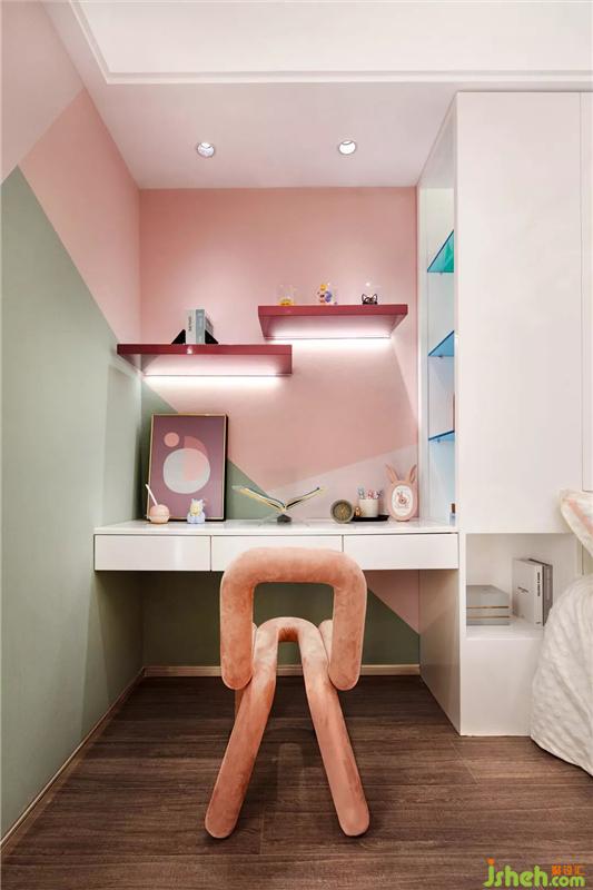 兒童房選用桃粉色為主色調(diào)搭配薄荷綠,墻面的色塊拼接是一種兼容的色彩手法,能夠把你喜歡的顏色統(tǒng)統(tǒng)“上墻”,以幾何圖案的形式呈現(xiàn)。居室中細(xì)膩浪漫的情懷撲面而來,純凈的少女粉還可傳遞出,可愛甜美溫馨感。