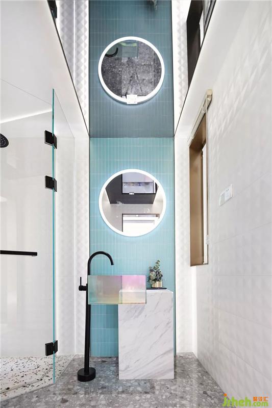 白色與水藍(lán)色交錯(cuò)的輕奢范兒空間中,搭配黑色金屬,將整個(gè)空間烘托的干凈清爽,打破常規(guī)的洗手盆將炫彩玻璃與大理石穿插相結(jié)合時(shí)尚又有趣味,用最直白簡(jiǎn)潔的方式讓你擁有一刻安寧與靜謐的時(shí)光。