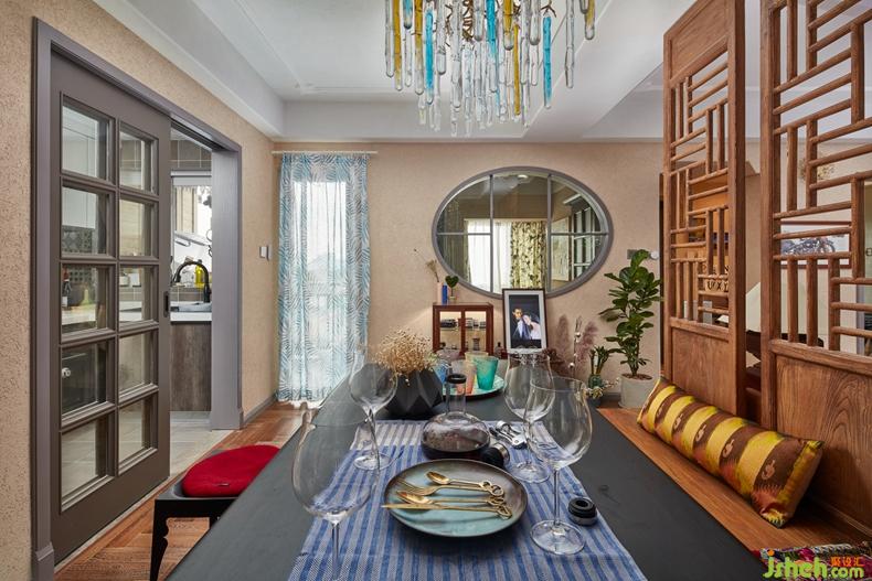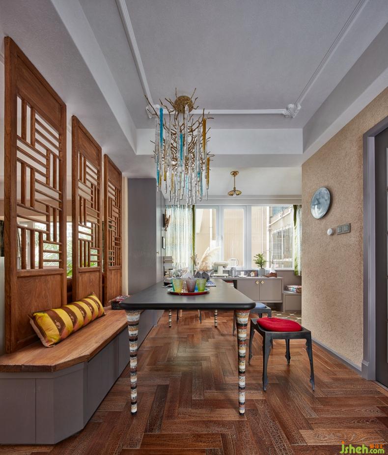 ▲ 餐廳和客廳用定制的實(shí)木屏風(fēng)隔開(kāi),保證客餐廳通透開(kāi)闊的同時(shí),也能做到功能分離。