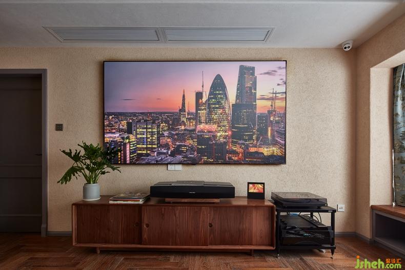 ▲ 客廳選擇的是最近比較火的極米激光電視,配備了100英寸的抗光幕。激光電視的優(yōu)點是方便安裝和搬家,觀影尺寸也比傳統(tǒng)液晶電視大很多,不過畫質(zhì)亮度對比度在強光下還是比傳統(tǒng)液晶的略差一些。但對于客廳光線不是非常強的戶型,這是一個不錯的推薦。
