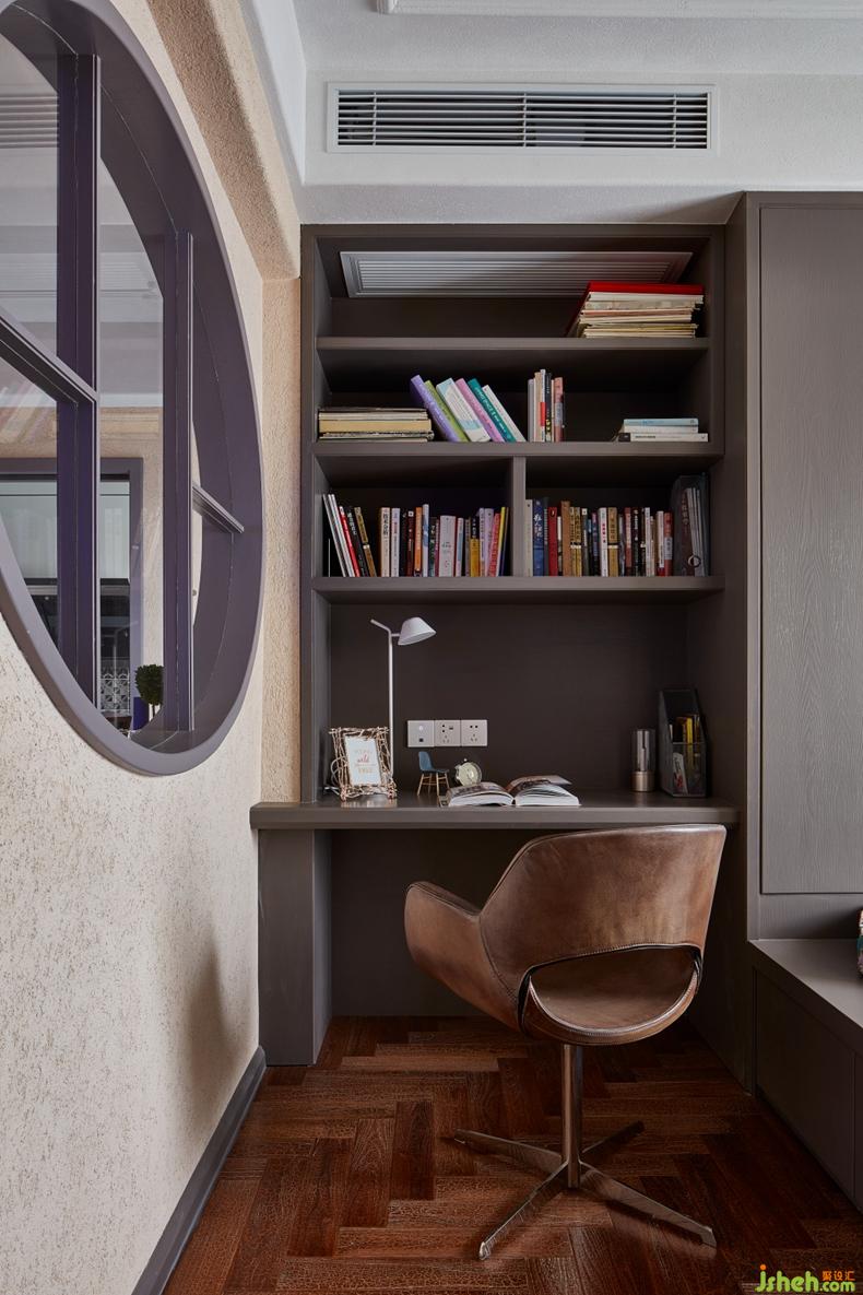 ▲ 書房與客廳的隔墻上開了一個橢圓窗,為本來光線不是很好的客廳區(qū)域增加采光,同時書房的空間感也得到拓展。