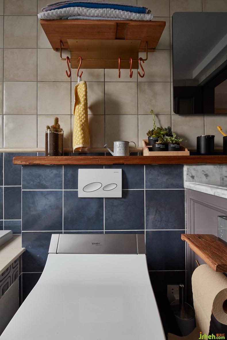 ▲隱藏式水箱的馬桶,層板和五金掛件選用都是經(jīng)過防水處理的老榆木點(diǎn)綴,提升質(zhì)感,也讓洗手間的設(shè)計(jì)風(fēng)格和整屋有一個(gè)連貫性、統(tǒng)一性。