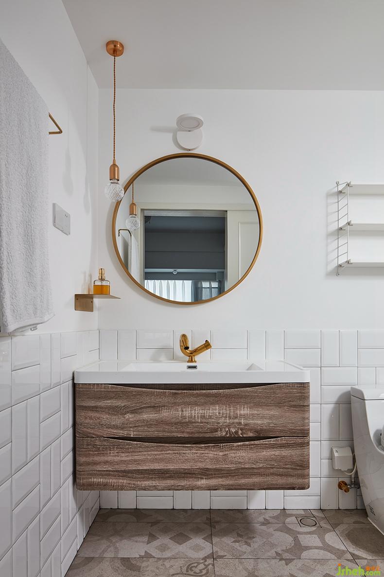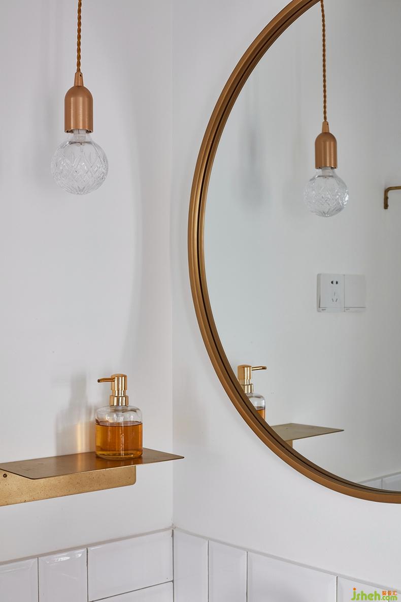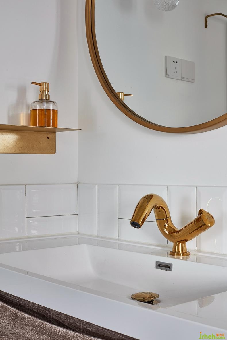 黃銅色的水龍頭、置物架和鏡子邊框,顏值與實(shí)用并存。