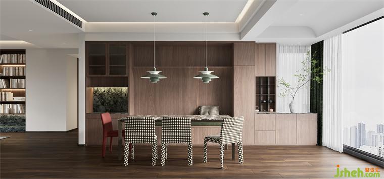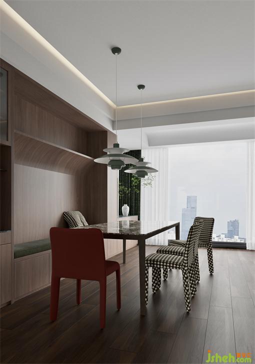 ①三米家居設計把餐廳陽臺封窗處理,陽臺融入到餐廳,餐廳瞬間寬敞許多,靠窗邊設置了一個喝茶區(qū),還在陽臺增加了一個儲物間。